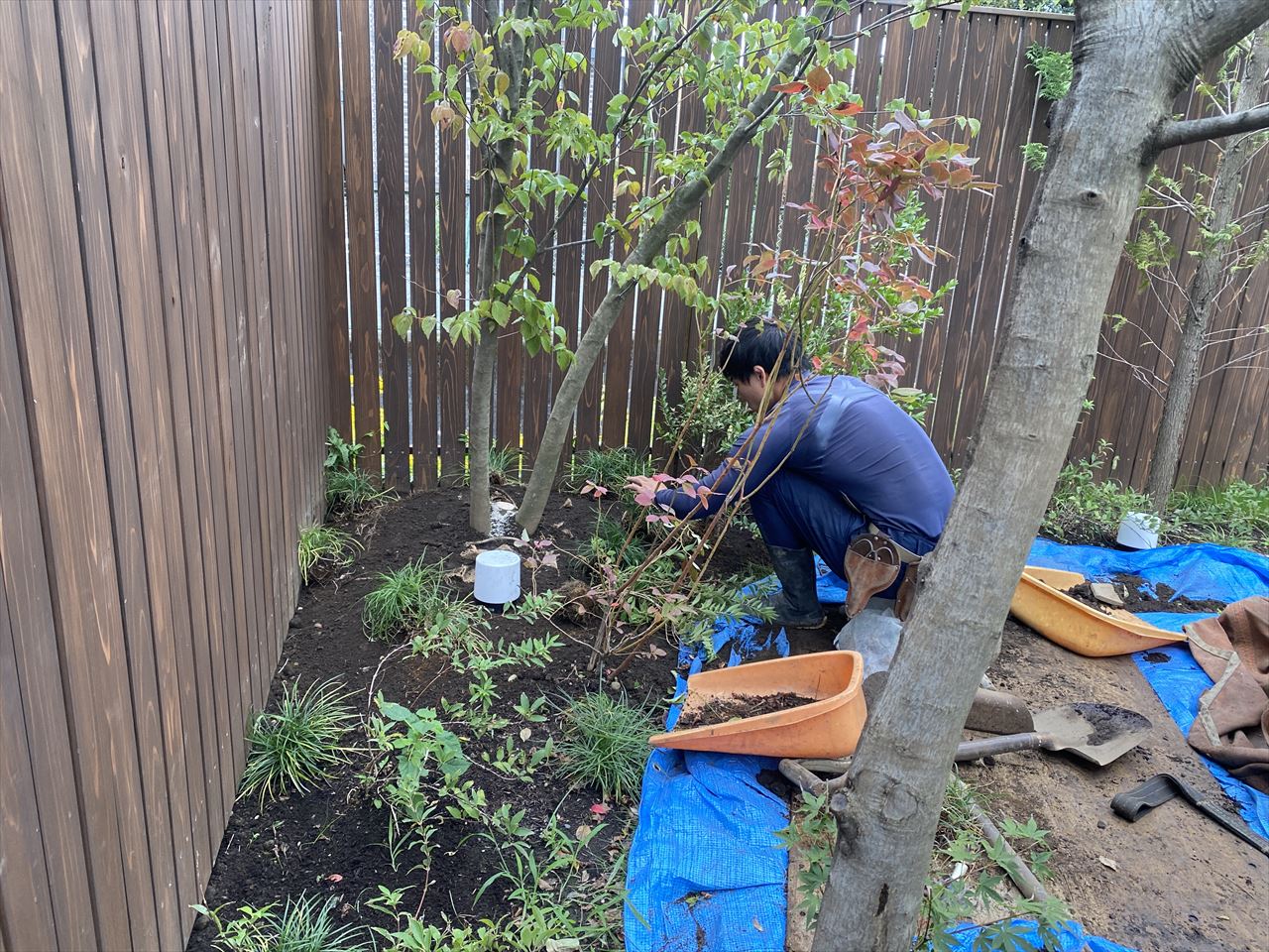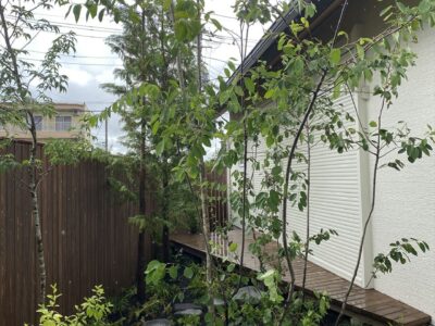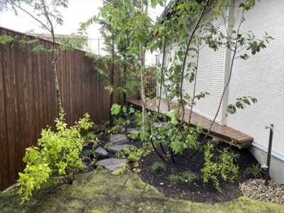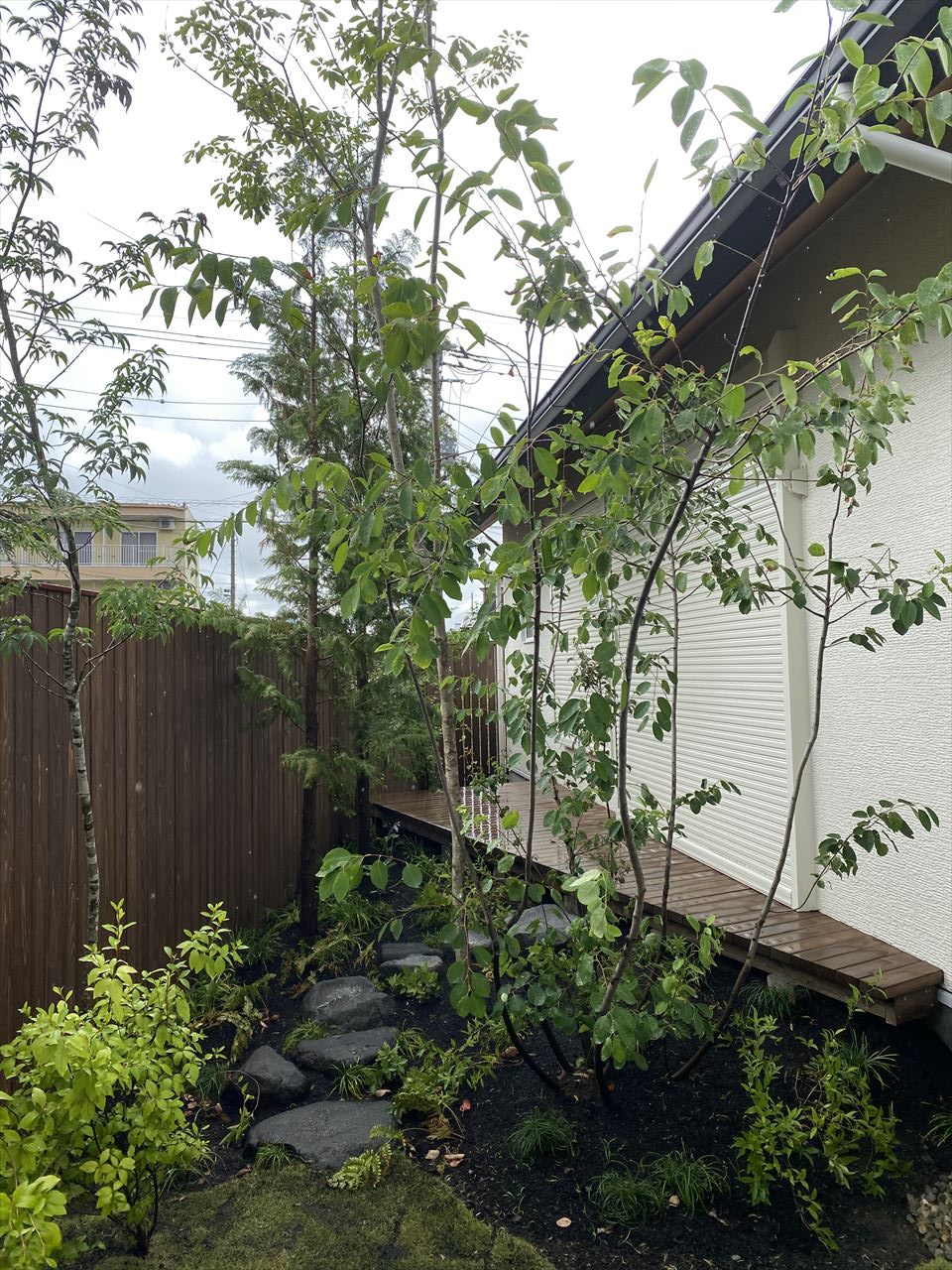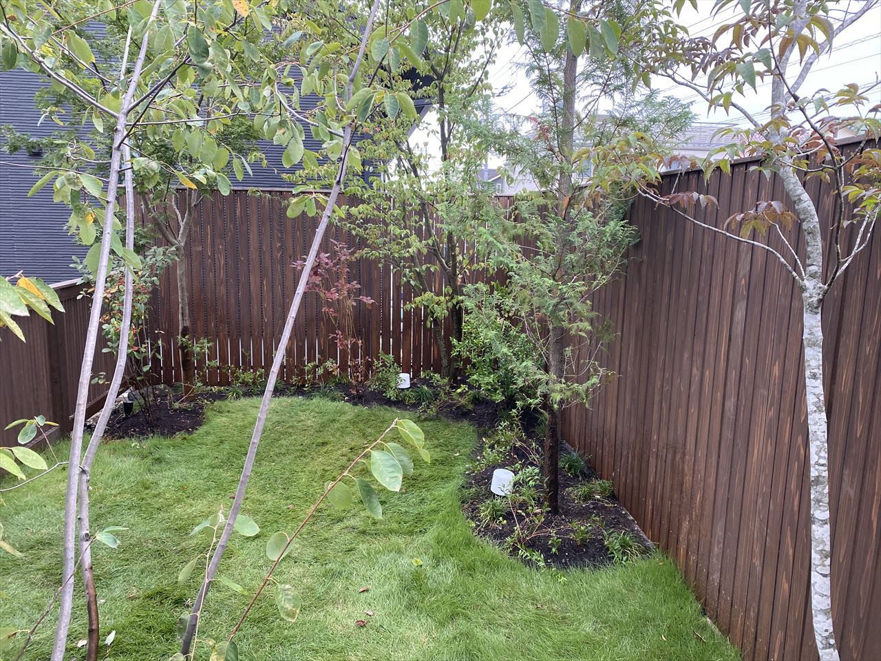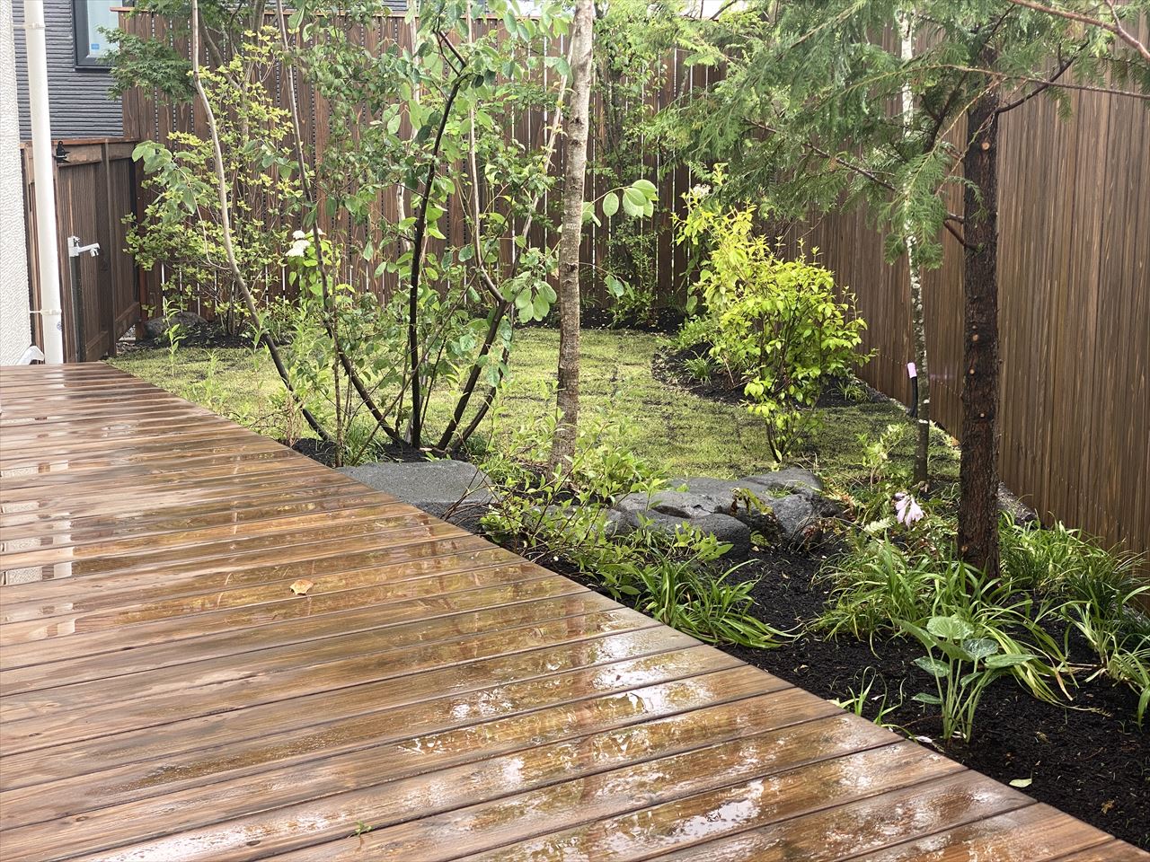 アウトドアリビングであるウッドデッキと天然芝を用いたドッグランを併せ持つ、プライベート空間を大切にした家族で楽しむ雑木の庭です。 ワンちゃんと小さなお子様が一緒に楽しむ光景は親御様はもちろん作り手のこちらもほっこりします。 笑顔の生まれるお庭。素敵ですね!